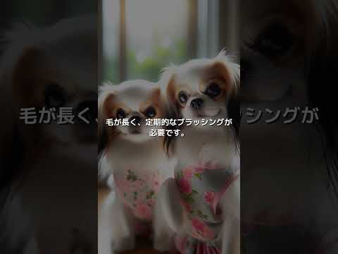 狆は小柄で丸い顔と大きな目が特徴です。 / 性格はおとなしく、飼い主に対してとても愛情深いです。 / 狆はあまり鳴かず、静かな家庭環境にも適しています。 / 毛が長く、定期的なブラッシングが必要です。 / 鼻が短く、呼吸器疾患に注意が必要です。 / 狆は室内での運動や遊びが十分です。 / 他の品種はプロフィールのリンクから見れるので要チェック